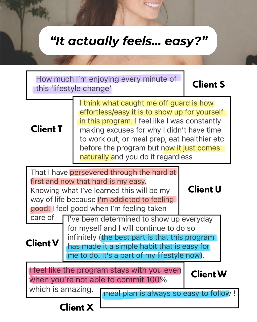 "I can't remember the last time I wanted to "lose weight". Now I want to be strong, confident, feel my best, and be happy. And I am. All because of your methods, your coaching, and your belief in me."